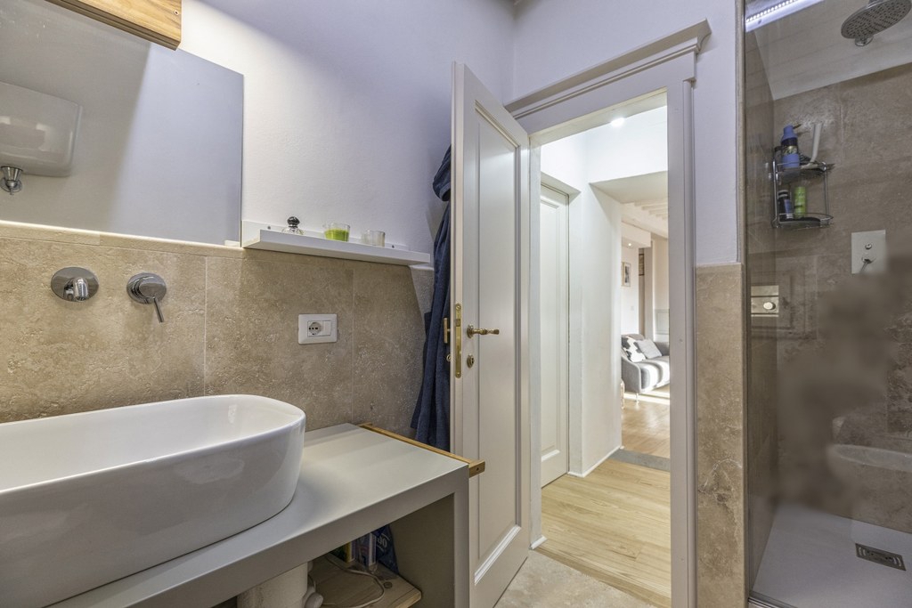 Spread over two levels, on the second and top floor you’ll find a large and bright living room, a high-quality custom-made kitchen, three bedrooms, and three elegant bathrooms. A wide and comfortable staircase leads to the upper floor, where the attic features a second living area, a master bedroom, and another bathroom. Every room is equipped with air conditioning, ensuring maximum comfort throughout the year.